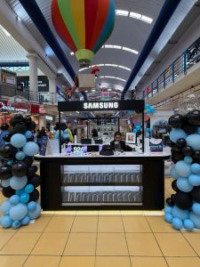 Vista de tienda Samsung en Albrook Mall durante la inauguración, con decoración en los colores corporativos de la marca y exposición del Galaxy S26 Series. (Imagen: Mirgor, abril 2026)
